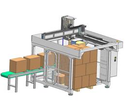 功能简述:该机为装箱类物品自动下线进行码垛栈板的专用设备。相较于机器人码垛,该机投入成本优势大,占地小,移动灵活,傻瓜式操作,能适用于低矮楼层的搬运码垛。